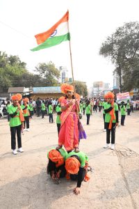 तसेच ती रॅली पुढे गंगा दरवाजा वरून काळा मारुती मार्गे छत्रपती शिवाजी महाराज यांच्या पुतळ्याजवळ आले त्या ठिकाणी शालेय विद्यार्थ्यांनी लेझीम,लाठीकाठी तसेच डंबेल्सवर आधारित थरारक प्रसंग सादर केला त्याचबरोबर विद्यार्थ्यांनी भारत माता की जय, वंदे मातरम, छत्रपती शिवाजी महाराज की जय या घोषणांनी त्या ठिकाणचे संपूर्ण वातावरण उत्साहाचे निर्माण झाले.